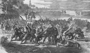 The town was first mentioned in 1406 under the name Lutuldisthat (from German Lutoldsstadt, translated Lutoldstown).[3] Lututów was a private town, administratively located in the Wieluń County in the Sieradz Voivodeship in the Greater Poland Province of the Kingdom of Poland.[4] It was annexed by Prussia in the Second Partition of Poland in 1793. In 1807 it was regained by Poles and included within the short-lived Duchy of Warsaw, and in 1815 it fell to the Russian Partition of Poland. The Battle of Lututów was fought there between Polish insurgents and Russian troops on June 15, 1863 during the January Uprising. It was eventually restored to Poland, when the country regained independence after World War I in 1918.