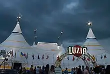 Luzia began its Grand Chapiteau tour in North America in a white and yellow Big Top whose solar system elements reflect the importance of space, and especially the moon, in Mexican culture. The main tent is white with yellow curves to represent the paths of the planets around the moon, and the artistic tent is yellow to represent the sun. A Tapis Rouge tent was introduced at the San Francisco run.[2]