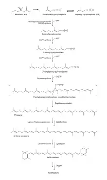 The unconditioned biosynthesis of lycopene in eukaryotic plants and in prokaryotic cyanobacteria is similar, as are the enzymes involved.[5] Synthesis begins with mevalonic acid, which is converted into dimethylallyl pyrophosphate. This is then condensed with three molecules of isopentenyl pyrophosphate (an isomer of dimethylallyl pyrophosphate), to give the 20-carbon geranylgeranyl pyrophosphate. Two molecules of this product are then condensed in a tail-to-tail configuration to give the 40-carbon phytoene, the first committed step in carotenoid biosynthesis. Through several desaturation steps, phytoene is converted into lycopene. The two terminal isoprene groups of lycopene can be cyclized to produce beta-carotene, which can then be transformed into a wide variety of xanthophylls.[5]