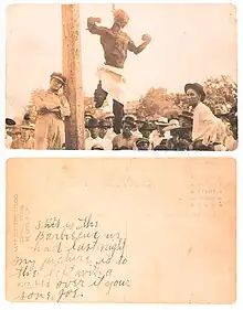 In the post–Reconstruction era, lynching photographs were printed for various purposes, including postcards, newspapers, and event mementos.[90] Typically these images depicted an African American lynching victim and all or part of the crowd in attendance. Spectators often included women and children. The perpetrators of lynchings were not identified.[91] The 1916 lynching of Jesse Washington in Waco, Texas, drew nearly 15,000 spectators.[90] Often lynchings were advertised in newspapers prior to the event in order to give photographers time to arrive early and prepare their camera equipment.[92]