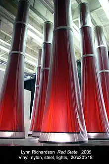 Art critic Amy Karlinsky, writing in BorderCrossings, opined that Richardson's "minimal and collapsible" Red State "hinted at her capacity to generate metaphor": its "monumentality" was "all sham and seductive illusion – a tidy reference to both art and politics". And Karlinsky had earlier enjoyed "Richardson's fabulous and funny kinetic sculptures of 2002", which in her view "invited viewer participation and provided wry commentary on Canadian icons and symbolism".[2] But Karlinsky found Inter-Glacial Free Trade Agency.ca "more fraught" by contrast, and agreed with the exhibition curator that Richardson's environmental concerns were integral to her works and had "catalyzed" her into production. How, she wondered, did you suggest something as vast as the Arctic? "A simulated and disjointed landscape confronts the viewer. It is a depopulated, dystopic scenario" with strange artistic details. "Much is eerie, evocative and otherworldly."[2]