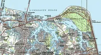 The Lynnhaven River is a tidal estuary located in the independent city of Virginia Beach, Virginia, in the United States, and flows into the Chesapeake Bay west of Cape Henry at Lynnhaven Inlet, beyond which is Lynnhaven Roads. It has a small, developed watershed covering 64 square miles (170 km2), terminating at Lynnhaven Bay. It was once famous along the East Coast of the United States for its oysters, which declined through pollution and runoff. It is now being restored by the Lynnhaven River Now restoration project based out of the Brock Environmental Center.[1] A proposed comprehensive project for ecosystem restoration of the Lynnhaven River Basin is currently under consideration by the United States Congress.[2]