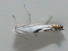 Lyonetiidae is a family of moths with some 200 described species.[1] These are small, slender moths, the wingspan rarely exceeding 1 cm. The very narrow forewings, held folded backwards covering the hindwings and abdomen, often have pointed apices noticeably up- or down-turned. The larvae are leaf miners.