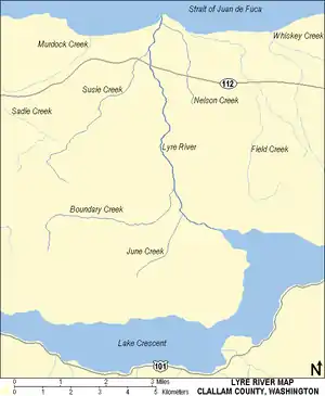 The Lyre River flows roughly northwest out of Lake Crescent, first encountering June Creek, then turning north at the point that is joined by Boundary Creek on the left. At River Mile 2.7 (48°07′25″N 123°49′37″W / 48.12348°N 123.82684°W) the river tumbles down the Lyre River Falls, which are impassable to fish migrating upstream. Continuing north, the river is joined by Susie Creek on the left, and finally Nelson Creek on the right before emptying into the Strait of Juan de Fuca at Low Point.