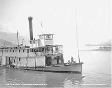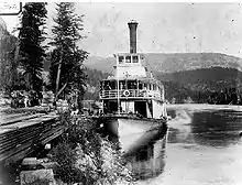 Once the rail supplies were loaded, the trip down the Columbia and the lakes began on July 3, 1890 at 11:30 a.m., as crowds cheered on the dock and the nearby steamer Kootenai. Three of the principals of the Columbia and Kootenay Steam Navigation had supplied most of the money for the construction of the Lytton and two of them, J. A. Mara and Frank Barnard were on board for the steamer's first trip.[2]