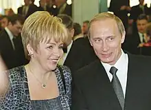Lyudmila Aleksandrovna Ocheretnaya[1] (Russian: Людмила Александровна Очеретная, pronounced [lʲʊdˈmʲilə ɐlʲɪkˈsandrəvnə ɐtɕɪˈrʲetnəjə]; née Shkrebneva (Шкребнева) and formerly Putina (Путина, pronounced [ˈputʲɪnə]); born 6 January 1958) is a Russian linguist who served as the First Lady of Russia from 2000 to 2008 and from 2012 to 2014 while married to her then-husband Vladimir Putin, the current president and former prime minister of Russia.