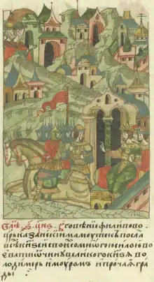 ![]() Mäxmüd sends an army to Moscow, miniature from the Illustrated Chronicle of Ivan the Terrible | |
