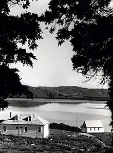 The WMS missionaries, led by John Hobbs and James Stack, relocated to the Hokianga harbour, where the following year, the Māngungu Mission was founded.[3] Soon half a dozen buildings had been erected on the site, on the shores of the Hokianga harbour near Horeke, for the missionaries and their families.[4] The mission was now led by William White, who had arrived in January 1830 to take over from Hobbs.[5] White's objective at Māngungu was to expand the reach of the WMS, and he duly established further missions at Kāwhia and Waingaroa, on the west coast of the North Island. He wanted to set up a station at Whangape but this did not eventuate due to a lack of personnel.[6]