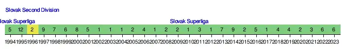 Following dissolution of Czechoslovakia in 1993, MŠK Žilina has been playing in the Slovak Superliga for the total of 23 seasons with the exception of 1995–96 season after relegation to the Second Division.