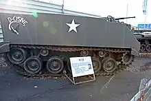 The vehicle has a welded steel hull ranging in thickness from 0.375 inches (0.95 cm) on the top to 1 inch (2.49 cm) thick on the belly with the median thickness being 0.625 inches (1.59 cm). Overall, it is rather slab sided in appearance with a blunt nose. The vehicle has a single large compartment with the driver sitting at the front left, and the commander sitting to his right. The driver is provided with an M19 infra-red night vision periscope and several M17 periscope for driving in a buttoned up position. The commander has an M13 cupola, with a .50-caliber M2 machine gun, for which 2,205 rounds are carried in the vehicle.