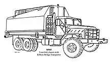 The M939 to M945 were chassis with cabs, meant to carry specialized bodies. They were available in long and extra long wheelbases, and with or without front winches. The largest was the M945 used to mount the so-called "Bat Wing" body Shop Equipment Organizational Repair Truck Mounted (SEORTM), the Antenna Mast section of Patriot Missile Batteries, and with oversized 14:00 R20 tires as a transporter to carry and launch Improved Ribbon Bridge sections and Bridge Erection Boats.[4][15]