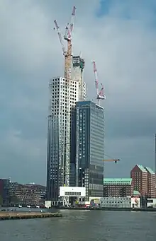 The Maastoren is designed by Dam & Partners Architecten. Also, the architecture firm Odile Decq Benoit Cornette was involved in the designing progress, and architecture firm OTH designed the interior of the office building.[2][7] The skyscraper consists of two main elements: one has a height of 165 metres (541 feet) and one is slightly turned compared to the first one and is around 105 metres (344 feet) tall.[7][28] Also, the Maastoren has a glass extension. The strength of the building is provided by a core with two inner walls, by other inner walls perpendicular to the core, and by the exterior that consists of prefab elements. These parts are made out of concrete.[7][29] The core is occupied by the restrooms and some of the elevators among other things. The area of the core varies depending on the height and its dimensions on average are 13 metres (43 feet) by 10 metres (33 feet). The core was constructed using a climbing formwork.[8][30][31]