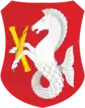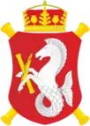 Blazon | Gules, a hippocamp Argent holding baton and quill in saltire, all Or. |