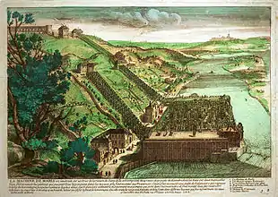 An engraving of the Paris Observatory from the beginning of the eighteenth century shows the wooden "Marly tower" on the right, a dismantled part of the Machine de Marly (the temporary tower replaced by La tour du Levant at the beginning of the Aqueduc de Louveciennes), moved to the Paris Observatory by astronomer Giovanni Domenico Cassini for mounting long telescopes.[15]