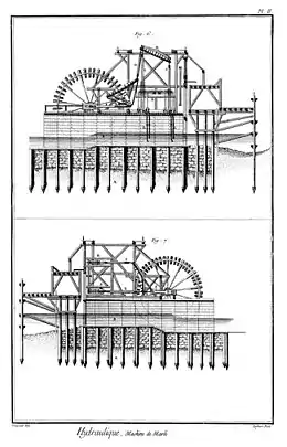 The Machine de Marly (French pronunciation: [maʃin də maʁli]), also known as the Marly Machine or the Machine of Marly, was a large hydraulic system in Yvelines, France, built in 1684 to pump water from the river Seine and deliver it to the Palace of Versailles.[1]