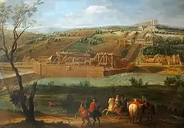 The work began in June 1681 with the canalization of the Seine. The construction of the machine began at the end of 1681. On June 14, 1682, a successful demonstration was held in the presence of Louis XIV.[6] The water could be elevated to the top of the hillside. The machine was inaugurated June 13, 1684[7] by the king and his court. The aqueduc de Louveciennes was completed in 1685 and the entire project, three years later, in 1688.