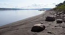 The river discharges more than 325 cubic kilometres (78 cu mi) of water each year, accounting for roughly 11% of the total river flow into the Arctic Ocean.[32][33] The river is frozen for most of the year, with the ice typically breaking up by early to mid-May in the south, and late May-early June in the north.[34] Ice breaks up earlier on the tributaries, sometimes causing ice jams and flooding where they meet the Mackenzie. In the middle of the larger lakes, such as Great Slave, ice can persist as late as mid-June. The river typically freezes by late October or November, starting in the north. Year round, the Mackenzie's outflow has a major stabilizing effect in the local climate above the Arctic Ocean with large amounts of warmer fresh water mixing with the cold seawater.[23]
