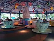 Mad Tea Party is a spinning tea cup ride at five of the six Disneyland-style theme parks around the world. The ride theme is inspired by the Unbirthday Party scene in Walt Disney's Alice In Wonderland, and plays a carousel version of the film's "Unbirthday Song". It was one of the opening day attractions operating at Disneyland on July 17, 1955.[3]