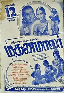 Madhanamala is a 1947 Tamil language film starring Sriram, T. R. Rajani, P. B. Rangachari, Vidwan Srinivasan, P. S. Veerappa, R. N. Nambiar, S. R. Janaki, T. S. Jaya, V. Rajalakshmi and V. Kumar. The film was directed by K. Vembu and produced by S. Soundararajan of Tamil Nadu Talkies.[1]