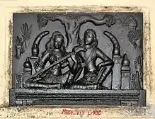Madhavi was the daughter of a dancer, Chitrapahti. Madhavi was rigorously trained in music, dance and composition of poems. Kovalan, the son of a wealthy merchant and the husband of Kannagi, met Madhavi in a performance in Chola king Karikalan's court. Enamoured of her beauty, he fell in love with her. Eventually, Kovalan left his wife and moved in with Madhavi, with whom he stayed for a year. Madhavi bore him a daughter Manimekalai. However, after spending all his money on Madhavi, he realised his mistakes and returned to his wife Kannagi.[2]
