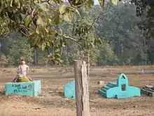 Tendu patta, or the leaves of the Diospyros melanoxylon[16] (an ebony tree with date-like fruit) in which tobacco is rolled to make beedis; is for the poor in this impoverished eastern Maharashtra district a crucial source of livelihood. Summer when temperatures touch 45 degrees Celsius, is peak earning time for the Madia. Tens of thousands of tribal women and children are engaged in collecting tendu leaves every summer. Women and children get up at 4.30 in the morning and walk towards the forests near their village. In no time the forests are transformed into a beehive of activity, with small armies of women and children plucking tendu leaves with assembly-line precision. The plucking session ends around 11 am and the women and children walk back balancing the weight of the leaves on their heads. Back in their villages, the women sort out the leaves and tie them up in bundles, squatting for hours inside their huts. They do the bulk of the work; it is they who bear the brunt of the hot sun and the drudgery. The day's collection of tendu patta is taken to the market or phad at around 4.30 pm and laid out in long, neat rows that stretch for acres in sun-baked fields or dry riverbeds. Men appointed by private contractors count the bundles and record them in their registers for future payments. The names in the register are those of the men. It is the husbands and fathers of the toiling women and children who claim the money. Although the tendu patta season doesn't last more than two weeks, each healthy family unit can make a significant earning in this time. Tendu patta thus helps the poor earn enough money to survive the two months before the onset of the monsoons.[17]