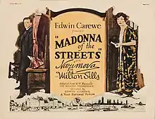 Madonna of the Streets is a 1924 American drama film directed by Edwin Carewe and written by Frank Griffin, Frederic Hatton, and Fanny Hatton. It is based on the 1904 novel The Ragged Messenger by W. B. Maxwell. The film stars Alla Nazimova, Milton Sills, Claude Gillingwater, Courtenay Foote, Wallace Beery, and Anders Randolf. The film was released on October 19, 1924, by First National Pictures.[1][2][3]