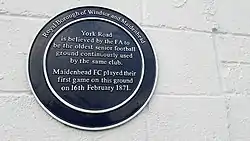 The club played their first home match at Bond's Meadow, before moving to York Road in 1871, with the first match at the new ground played on 16 February 1871 against Marlow.[3] York Road had been a cricket ground from the late eighteenth century, and is acknowledged as the "oldest senior football ground continuously used by the same club".[2] The freehold of the ground was bought in 1920.[3] The club's record attendance of 7,920 was set for an FA Amateur Cup quarter-final against Southall on 7 March 1936,[17] with Maidenhead winning 1–0.[8]
