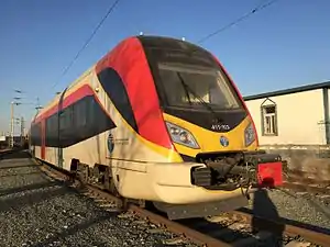 A contract for the purchase of 6 new passenger train sets, manufactured by China's CRRC Corporation at the Zhuzhou Electric Locomotive Works, was signed in 2014. The first train-set arrived in August 2015. Each train consists of 3 rail cars, and is designed to carry 200 passengers. They will be used on routes from Skopje to Bitola, Gevgelija, Kičevo, Kumanovo, and Veles.[1] This is the first time North Macedonia has bought new passenger trains since its independence,[1] and the first time a Chinese EMU or DMU manufacturer has entered the European market.[2]
