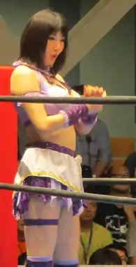 Makoto's 2009 was highlighted by a feud with her former partner Etsuko Mita, which built to Mita's retirement match on November 1, 2009, where she defeated Makoto.[27][28][29] The feud with Mita also led to the evolution of Makoto's character, turning her from a weak and scared comedic character to a more serious competitor.[1][2] In 2010, Makoto began making appearances for other promotions such as Kaientai Dojo, Osaka Pro Wrestling, Pro Wrestling Zero1 and Smash.[27] On December 26 at Ribbon Mania 2010, Makoto faced Tajiri in a losing effort.[30] In January 2011, Makoto became the leader of a stable named "Heisei YTR" (Young Traditional Revolution), which also included Chii Tomiya, Hikari Minami, Kurumi, Riho and Tsukushi.[31] The group mainly feuded with the "Ichinisanshidan" stable, which included Hikaru Shida, Miyako Matsumoto, Mochi Miyagi, Tsukasa Fujimoto and Mika Iida, who was originally a member of Heisei YTR, but switched sides early on in the rivalry.[31][32] On February 6, Makoto and Riho made it to the finals of the Ike! Ike! Ima, Ike! Ribbon Tag Tournament, before being defeated by Hikaru Shida and Tsukasa Fujimoto in a match that was also contested for the International Ribbon Tag Team Championship.[33] On March 21, Makoto had another high-profile match against a male wrestler, when she was defeated by Taka Michinoku at Ice Ribbon March 2011.[34] During the first half of 2011, Makoto also made several appearances for Union Pro Wrestling, where she portrayed a tougher villainous character, working under the ring name Makoto-hime ("Princess Makoto") and managing Cao Zhang and Choun Shiryu during their Big China Unified Nakahara Tag Team Championship reign.[11][35][36]