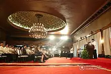 This room, the largest in the palace today, is also known as the ballroom, used for state dinners and large assemblies, notably the mass oath takings of public officials begun by President Ramos. The upholstered benches are lined up for guests on such occasions. When the room is used for state dinners, the benches are removed and round tables set in place. Orchestras sometimes play from the minstrels' galleries at two ends of the hall.[15]
