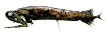 Malacosteus niger, commonly known as the black dragon fish, is a species of deep-sea fish. Some additional common names for this species include: northern stoplight loosejaw, lightless loosejaw, black loosejaw, and black hinged-head.[1] It belongs to the family Stomiidae, or dragonfishes. It is among the top predators of the open mesopelagic zone.[2] M. niger is a circumglobal species, which means that it inhabits waters ranging from the tropics to the subarctics.[3] Not many studies have been conducted on its feeding habits, but recent research suggests that M. niger primarily feed on calanoid copepods which is a form of zooplankton. Indeed, it appears that M. niger primarily prey on zooplankton despite its apparent morphological adaptations for the consumption of relatively large prey.[2] Another unique adaptation for this species is its ability to produce both red and blue bioluminescence. Most mesopelagic species aren't capable of producing red bioluminescence. This is advantageous because most other species cannot perceive red light, therefore allowing M. niger to camouflage part of itself to its prey and predators.