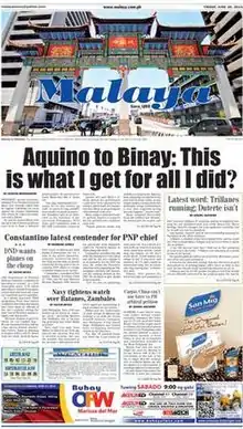 Malaya, originally named Ang Pahayagang Malaya ("The Free Newspaper" in Filipino),[2] is a broadsheet newspaper in the Philippines, headquartered at Intramuros, Manila, and owned by People's Independent Media Inc. The newspaper is known for being one of the publications that fought against the presidency of Ferdinand Marcos.