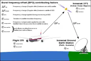 • Burst frequency offset (BFO) – The difference between the expected and received frequency of transmissions. The difference is caused by doppler shift as the signals traveled from the aircraft to the satellite to the ground station; the frequency translations made in the satellite and at the ground station; a small, constant error (bias) in the SDU that results from drift and ageing; and compensation applied by the SDU to counter the Doppler shift on the uplink. This measure can be analysed to determine where along the BTO rings the aircraft was located.[11]:9–11[12]:18