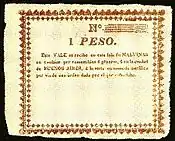 The peso was a promissory note which was issued on the Falklands Islands (Spanish: Islas Malvinas) by Luis Vernet from around 1828 until the islands were invaded by the British in August 1833. Vernet, who was appointed Governor by the United Provinces of Rio de la Plata in 1829, paid workers on the islands in these promissory notes.[1]