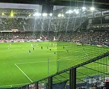 By the 2002–03 season, Manchester City were back in the Premier League. An unusual route into European competition for the 2003–04 season was provided by the UEFA Respect Fair Play ranking, which allocated extra UEFA Cup qualifying round places for the leagues with the best records for discipline and positive play.[45] This marked Manchester City's first European participation for 24 years. In the qualifying round City played Welsh club Total Network Solutions. The first leg was the first-ever competitive match at Manchester City's new ground, the City of Manchester Stadium. Trevor Sinclair became the first ever goalscorer at the stadium in a 5–0 win.[46] In the hope of attracting a large crowd, TNS switched the second leg to Millennium Stadium, the national stadium of Wales.[47] With the tie effectively won, City made 10 changes to their team.[48] The match finished 2–0 to City. Against Sporting Lokeren in the first round proper, City won the home leg 3–2, and the away leg 1–0.[49] A tie against Groclin Dyskobolia followed. Both legs were drawn,[50] and just as in 1976, City were eliminated on away goals after a 0–0 draw in Poland.