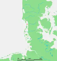 Mandø is geographically one of the northernmost islands among the North Frisian Islands off the southwestern Danish and northwestern German coast.[6] The Frisian Islands are generally the line of demarcation separating the North Sea from the Wadden Sea, which is a shallow sea of approximately 5000 square kilometers in size, riddled with small islands and tidal flats. The entire Wadden Sea area was formed by intervening riverine depositional periods between Ice Age glacier movements.