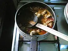 Their curry uses a lot of coconut and curry leaves while ginger, garlic and chilli are also used. Mangalorean Catholic cuisine has distinct Portuguese influence as can be seen in Laitao, the famous pork roast served as the Pièce de résistance at wedding dinners, and Pork Sorpotel. Fabled cooks like Davidam or Alicebai were called in to help with the repast. Mangalorean Catholics mix pork blood and other parts in most of their pork delicacies as can be seen from Pork Bafat, Cabidela and Kalleze un Kiti (heart and intestines). Sanna–Dukra Maas (Sanna – idli fluffed with toddy or yeast; Dukra Maas – Pork)[1] and Unde–Dukra Maas (Unde – leavened bread; Dukra Maas – Pork) are popular dishes. Chicken Indaz is also popular. The traditional Rosachi kadi (Ros Curry), a fish curry made with ros (coconut milk) is quite popular and is served during the Ros (anointing) ceremony that is held 1 or 2 days before a Mangalorean Catholic wedding. Their fish curry especially their Fish Roe Curry, is known for its taste in the whole of coastal India while fried fish in their style is well known. The Sheveo Roce and Pathal Bakri (a variant of Kori Rotti) are dry rice flakes dipped in chicken gravy dishes.[2]