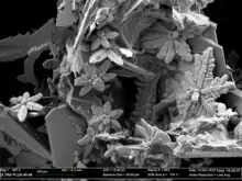 Manganese disilicide (MnSi2) is an intermetallic compound, a silicide of manganese. It is a non-stoichiometric compound, with a silicon deficiency expressed as MnSi2–x. Crystal structures of many MnSi2–x compounds resemble a chimney ladder and are called Nowotny phases. They include MnSi2 (x=0), Mn4Si7 (x=0.250), Mn11Si19 (x=0.273), Mn15Si26 (x=0.267) and Mn27Si47 (x=0.259). These phases have very similar unit cells whose length varies from 1.75 nm for MnSi2 or Mn4Si7, which have almost the same structures, to 11.8 nm for Mn27Si47.[5]