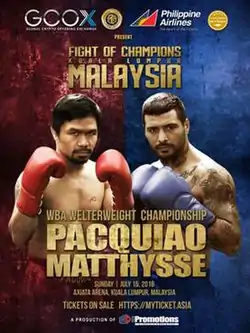 Manny Pacquiao vs. Lucas Matthysse, billed as Fight of Champions, was a boxing match for the WBA (Regular) welterweight championship. The event took place on July 15, 2018 at the Axiata Arena in Kuala Lumpur, Malaysia.[2][3][4] Pacquiao won the fight by 7th-round TKO[5] and Matthysse announced his retirement shortly thereafter.[6]