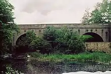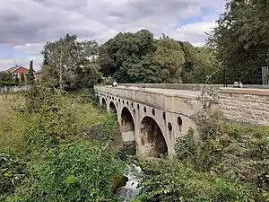The line was opened on 13 April 1819, when "the first load of coals was brought in to the Company's wharf [at Mansfield]... the coal was unloaded and taken to the market place where it was heaped up and set on fire."[4][2] This was evidently a major event in the locality: crowds met the incoming train at the five-arch bridge "where they met ten waggons laden with coal from the Pinxton colliery... the assemblage amounted to some thousands... Having arrived at the market-place about three o'clock, which, not withstanding the heavy rain falling at the time was thronged with people, the band struck up "God Save the King"... Nearly three hundred of the workmen who had been employed during the last three months on the road, then returned to partake of a dinner, provided for them by the proprietors, at different public houses in the town."[6]