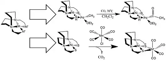 Darensbourg et al. reported that metallodithiolates ligands with nickel centers can increase the electron density of bonds such as Fe-S, allowing them to be cleaved easily.[13] Darensbourg et al. also determined that this nickel center complex associated with a lead atom also plays an important role in the addition of CO and ethylene in the Suzuki-Miyaura reaction, which couples the organic compounds of boron and the halides, along alkyl halides and alkylboranes.[14] Furthermore, with the cCobalt center, the metallodithiolates ligands can catalyze the transfer of NO and nitrosylate moieties, which allows the glycosidase conjugation of dinitrosyl iron complexes. With this conjugation, other carbohydrates can achieve higher potential in attaching for drug delivery.[7]