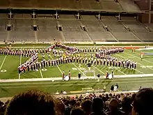 "Revised Entrance #3", originally based on the ″Governor′s March″ (1935) by Col. Armin F. Hand, the pregame opener and calling card of the Marching Illini, combines an opening fanfare with a march version of the Illinois state song.[14] The band moves into dual U of I logos, and then transform into four arcs – two arcs facing each sideline. Sousaphones and percussion are centered between the arches, while the auxiliaries flank both sides of the band. “Patriotic Medley” follows, and the winds adjust to an outline of the United States, while the percussion form the state of Illinois with one cymbal player strategically placed in Champaign. At the climatic point of “God Bless America,” a dramatic high chair 4-count turn to the home stands accompanies a downward cascade in the music, and the crowd invariably applauds. After a short mark-time, the formation changes to a large rectangle. During “Battle Hymn of the Republic,” the rectangle compresses into a circle, pentagon, and finally a star, where the band halts and finishes the medley with the closing phrases of “America The Beautiful.”