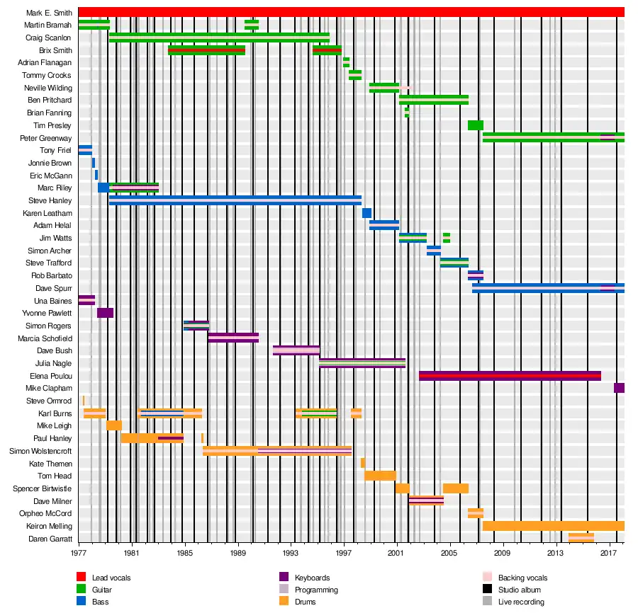 The Fall were an English post-punk band from Prestwich, Greater Manchester. Formed in late 1976, the group originally featured vocalist Mark E. Smith, guitarist Martin Bramah, bassist Tony Friel and keyboardist Una Baines, with their first permanent drummer Karl Burns joining the following year. The group went through many lineup changes but remained active until Smith's death on 24 January 2018, at which point the band included bassist Dave "The Eagle" Spurr (since 2006), guitarist Peter "PP" Greenway, drummer Keiron Melling (both since 2007) and keyboardist Michael Clapham (who joined for the band's final tour in 2017).[1][2]