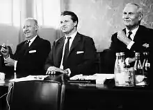 Wallenberg was chairman of the Swedish Bankers' Association twice, 1949-1951 and 1955-1957[8] and chairman of the Research Institute of Industrial Economics from 1950 to 1975 (honorary chairman from 1975).[10] He was chairman of the Council of European Industrial Federations (CEIF) from 1960 to 1963 and in the Business and Industry Advisory Committee to the OECD (BIAC) from 1962 to 1964. Wallenberg was a member of the Economic Planning Council (Ekonomiska planeringsrådet) from 1962 to 1964 and chairman of the International Chamber of Commerce from 1965 to 1967.[9] He was a member of the Steering Committee of the Bilderberg Group from 1954 to his death in 1982. He was also a board member of Knut and Alice Wallenberg Foundation[9] and the Nobel Foundation.[10] Wallenberg co-chaired the ICC-UN/GATT Economic Consultative Committee from 1969 to 1971. In 1969, he left the post of vice chairman of Stockholms Enskilda Bank and became chairman for two years until 1971 when the bank merged with Skandinaviska Banken and formed Skandinaviska Enskilda Banken. Wallenberg was chairman there from 1972 to 1976.[10]