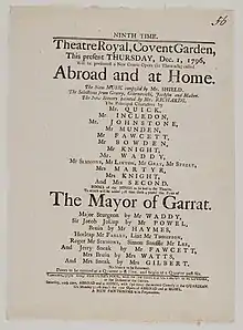 Her (and her husband's) first appearance at Covent Garden took place on 25 September 1795 as Bridget in The Chapter of Accidents.[3] Her husband is credited with writing the 'Masked Friend', which was presented at Covent Garden for the benefit of Mr. and Mrs. Knight, on the 6 May 1796. Her husband played Squire Turnbull and she appeared as Miss Turnbull. 'Hints for Painters', an unprinted farce, was given on the same occasion.[5]