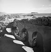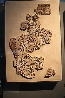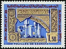 Following this episode, van Berchem undertook a second trip to Algeria in 1949 and another year later a first reconnaissance mission to Sedrata.[6] This was followed by two systematic archaeological expeditions: in the course of the first one, which took place from the end of 1950 to the beginning of 1951, she used aerial archaeology to examine the extent of the site, including its streets and channels. A hydro-survey was conducted as well. Limited excavations discovered a large building that was decorated with columns and arches. The second campaign, which took place from late 1951 to early 1952, discovered a residential complex with finely decorated stucco panels. Some fifty boxes of finds were sent to Algiers. However, van Berchem had to give up the project altogether after the beginning of the Algerian Revolution in 1954. A large part of her findings were published posthumously in 2017.[14][15]