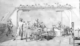 Paulze accompanied Lavoisier in his lab during the day, making entries into his lab notebooks and sketching diagrams of his experimental designs. The training she had received from the painter Jacques-Louis David allowed her to accurately and precisely draw experimental apparatuses, which ultimately helped many of Lavoisier's contemporaries to understand his methods and results.[5] Furthermore, she served as the editor of his reports. Together, the Lavoisiers rebuilt the field of chemistry, which had its roots in alchemy and at the time was a convoluted science dominated by George Stahl’s theory of phlogiston.
