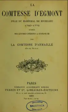 - 1890, La comtesse d'Egmont, fille du maréchal de Richelieu (1740-1773) d'après ses lettres inédites à Gustave III[6] (text)