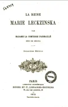 Faithful to the traditions of her family, she was interested in historical and literary matters. Moreover, she brought together a society that shared her interests.[3] She began to publish in 1864 with a study on the Queen of France, Marie Leszczyńska, wife of King Louis XV, which earned her the privilege of an article by the French literary critic Charles Augustin Sainte-Beuve.[3][4]