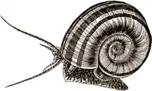 Drawing of a live individual of Marisa cornuarietis: the visible soft parts are covered in dark spots. The edge of the round operculum is visible under the shell. | |